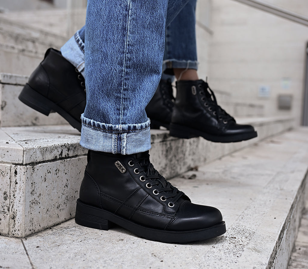 The Frank line men's leather ankle boot gives a special touch to your winter looks. This classic ankle boot combines a lace-up closure, a back pull-up for easy donning, and a lugged rubber sole for comfortable walking. In black leather with a side logo, these boots have a 3.5-cm heel that makes them perfect for everyday wear.
